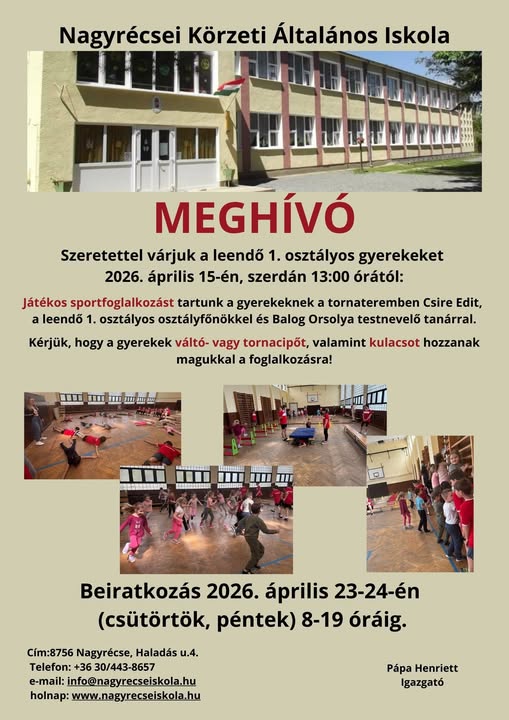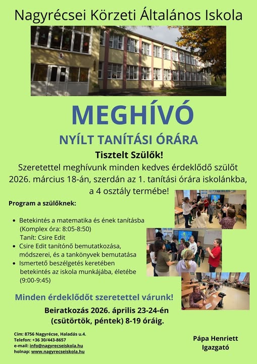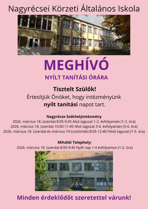 A 2026/2027. tanévi iskolai hit-és erkölcstan oktatásának megszervezéséről szóló tájékoztató napot tartunk a Nagyrécsei Körzeti Általános Iskola Székhelyintézményében és a Miháldi Telephelyen 2026. március 4-én, szerdán 16.00. órától. A hitoktatással kapcsolatos kérdéseiket telefonon is fel tudják tenni az egyházak képviselőinek.